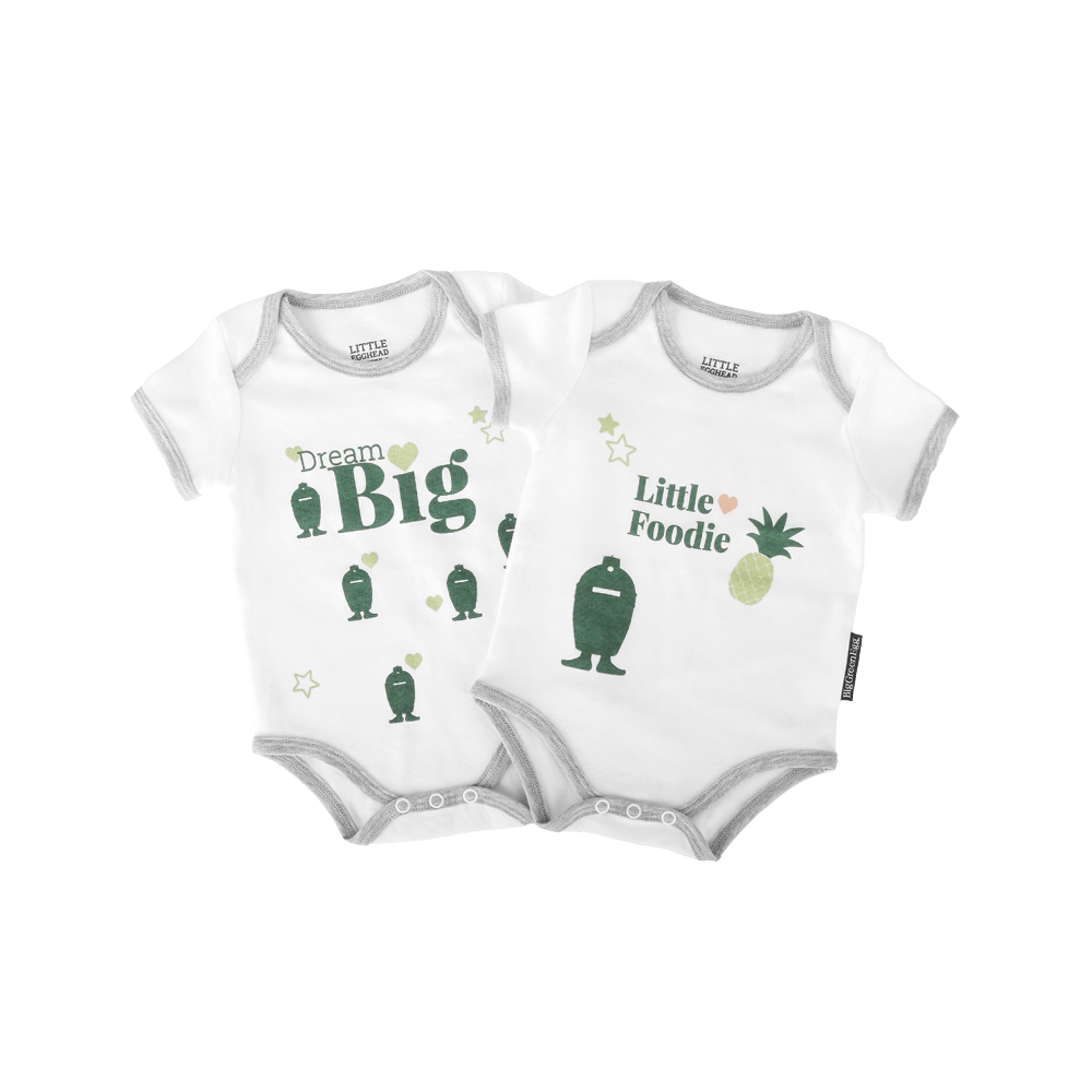 EGGen zelebriert man gemütlich mit Freunden oder Verwandten. Selbstverständlich gehören die Allerkleinsten auch dazu. Speziell für sie haben wir die Little EGGhead collection by Big Green Egg entwickelt. Dieses Set aus der Kollektion besteht aus zwei weißen Babybodys, die jeweils mit einem eigenen einzigartigen Print versehen sind: Dream Big & Little Foodie Diese süßen Kurzarmbodys aus weicher Bio-Baumwolle sind mit einer hellgrauer Biese abgesetzt. Herrlich bequeme Unterwäsche, die sich sehen lassen darf!