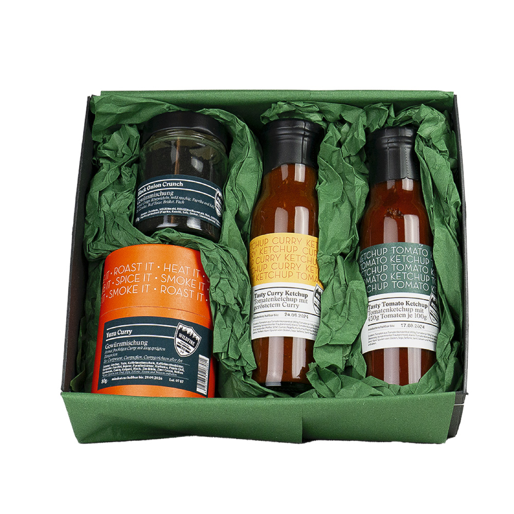 Eine köstliche Curry Box, die den kalten Winterabenden einen besonderen Geschmack verleiht. Eine sehr sorgfältig zusammengestellte Box, mit einem besonderen Tasty Tomato Ketchup, einer Yuzu Curry Gewürzemischung, einer Black Onion Crunch Gewürzemischung und nicht zuletzt einem Tasty Curry Ketchup, um Deinen Curryhunger zu stillen.