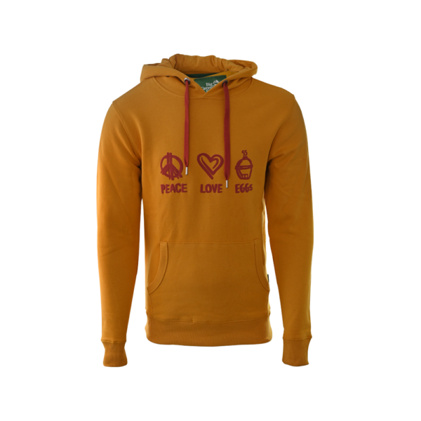 Hoodie – Peace, Love, EGGs – Ockergelb/Bordeaux