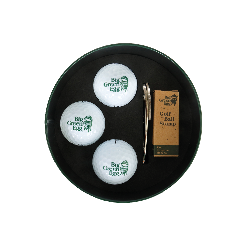 Bist du auf der Suche nach einem außergewöhnlichen Geschenk für Golffreunde, die zugleich leidenschaftliche EGGer sind? Wie wäre es mit diesen Golf-Basics in einer Geschenkbox? Der Deckel dieser stilvollen grünen Geschenkbox ist mit einem weißen Big Green Egg-Logo versehen. Der Inhalt besteht aus 3 weißen Golfbällen, 2 Tees, einem Golfballstempel und einer Pitchgabel mit magnetischem Ballmarker. Jedes einzelne Teil in der Box ist mit dem Big Green Egg-Logo versehen. Die Seitenwand der Metalldose dieses großartigen Geschenks schmückt ein origineller Text in weißer Schrift: Birdie on the Green. Chicken on the EGG.