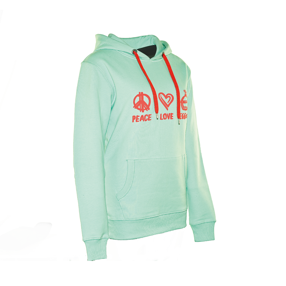Peace, Love & EGGs. Dieser bequeme Hoodie für Damen vereint alle schönen Elemente des Lebens. Der korallenfarbige 3D-Druck auf dem Vorderteil zeigt, wofür du stehst. Herrlich kuschelig, wenn du auf dem Big Green Egg bei kühlem Wetter etwas Leckeres zubereiten möchtest, aber auch super für entspannte Sonntage auf dem Sofa oder für den Weg ins Fitnessstudio. In diesem bequemen, mintgrünen Hoodie mit Kängurutasche siehst du immer spitze aus!