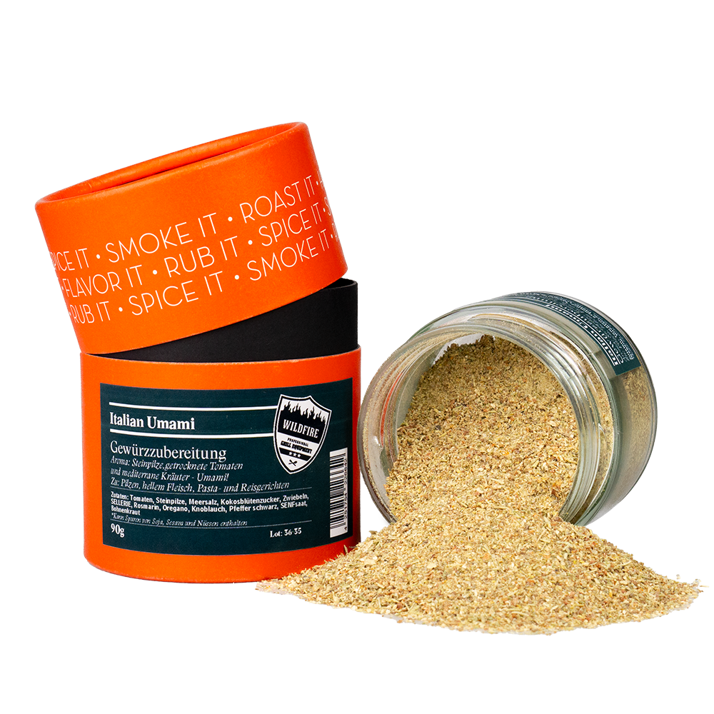 Im Rahmen der Partnerschaft zwischen der Big Green Egg Deutschland GmbH und der Gewürzmühle Rosenheim ist die Wildfire Gewürzedition entstanden, die neben klassischen Rubs, einzigartige Mischungen wie etwa das Wildfire ‚Yuzu Curry‘ oder den Dessertrub ‚Honeyballs‘ umfasst. Natürlich darf in der Wildfire Linie ein mediterraner Klassiker für Fleisch-, Pilz-, Reis- und Pastagerichte nicht fehlen. So entstand die Gewürzzubereitung ‚Italian Umami‘.