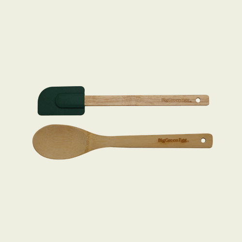 Handliche Silikonmatte in der Big Green Egg-Version, inklusive passendem Teigschaber und Holzlöffel.