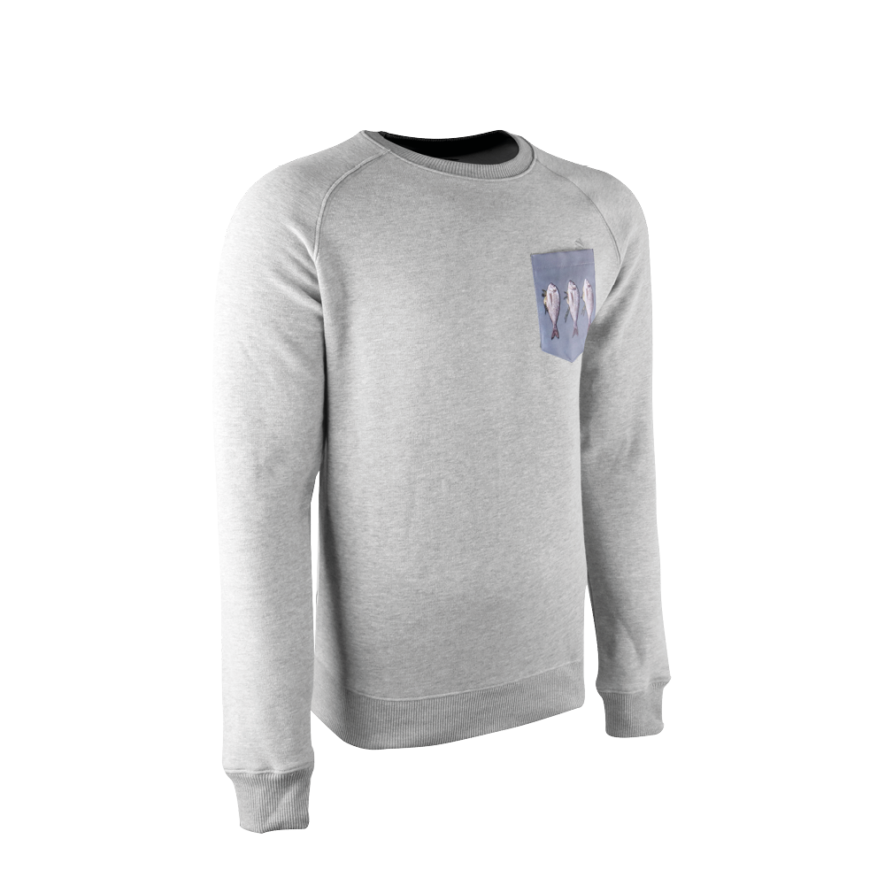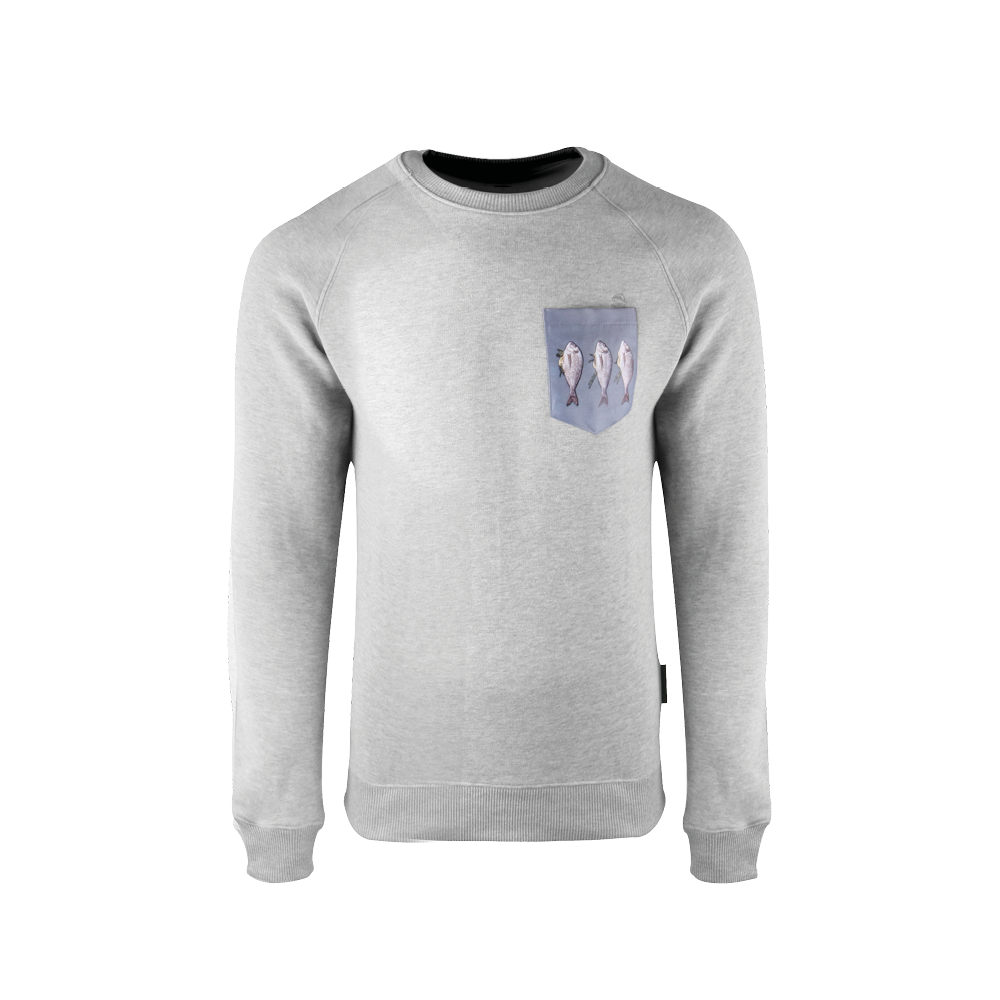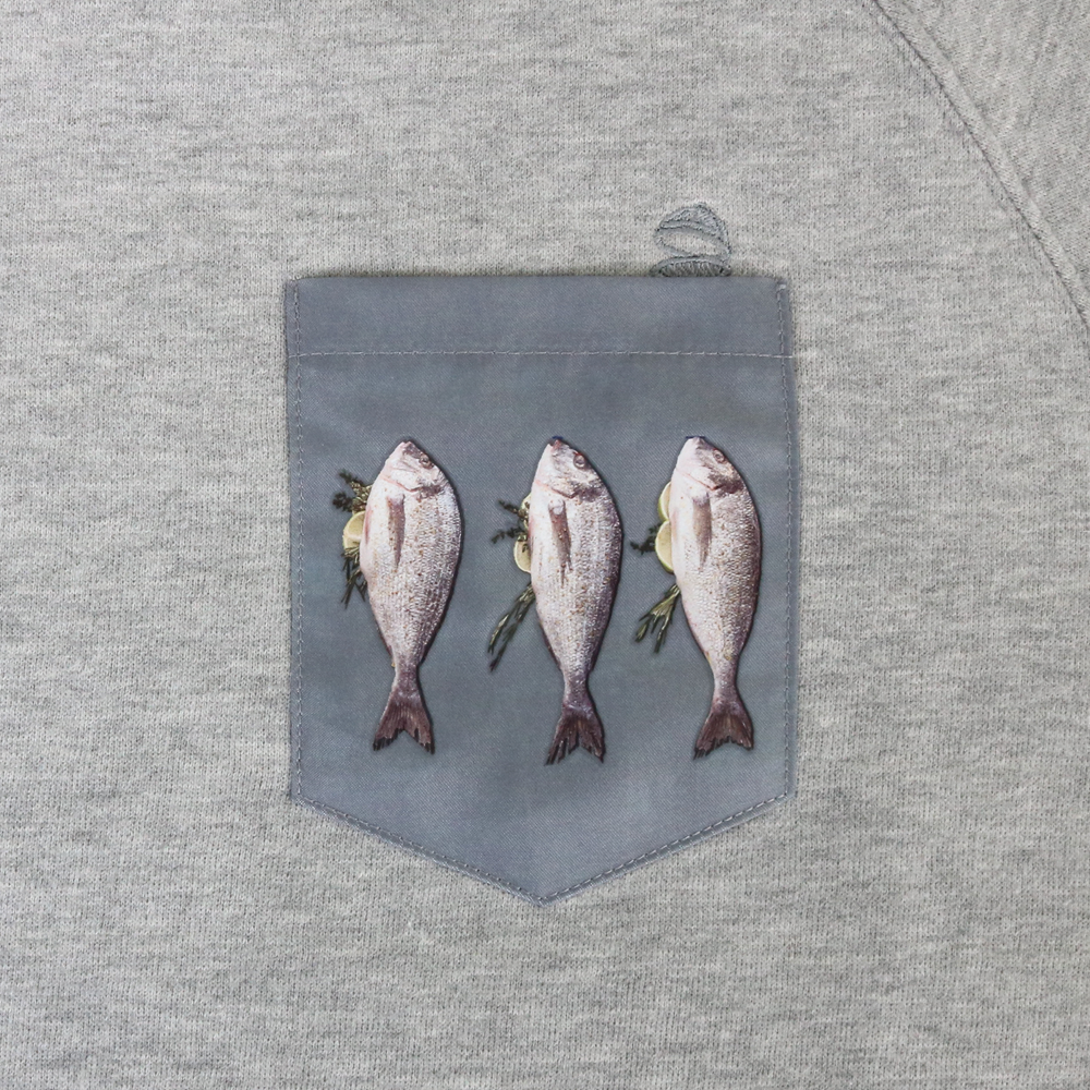 Farbe: Hellgrau mit Fischmotiv auf der Brusttasche.