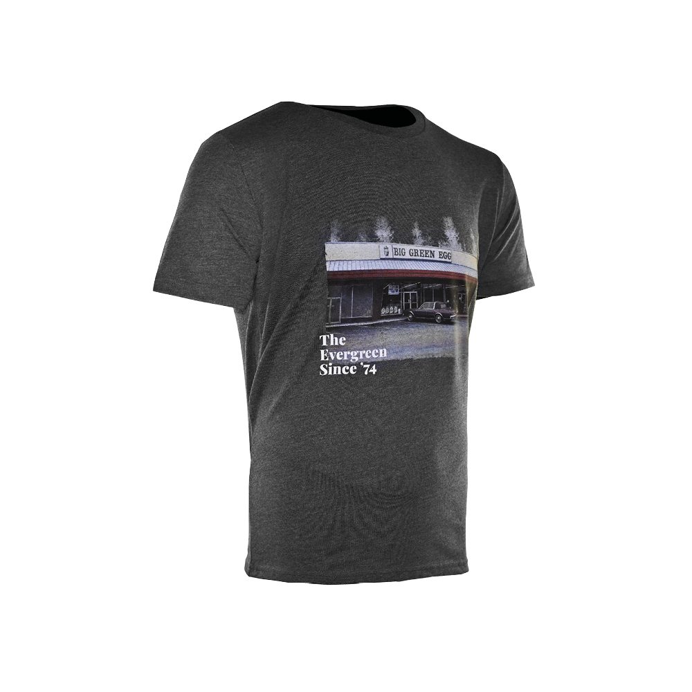 Hast du dich für den Evergreen unter den Keramikgrills entschieden? Mit diesem coolen T-Shirt aus der The Evergreen-Kollektion zeigst du allen, woran dein Herz hängt: am Big Green Egg! Das dunkelgraue T-Shirt ist mit einem besonderen Vintage-Print des ersten Big Green Egg-Shops in Atlanta, der Wiege des Big Green Eggs, versehen. Die weiße Aufschrift „The Evergreen Since ‘74“ erzählt den Rest der Geschichte. Weitere nette Details sind die dunkelgrüne Biese auf der Innenseite des Halsausschnitts und die weiße Aufschrift „Big Green Egg“ auf dem linken Ärmel.