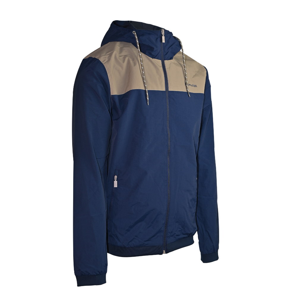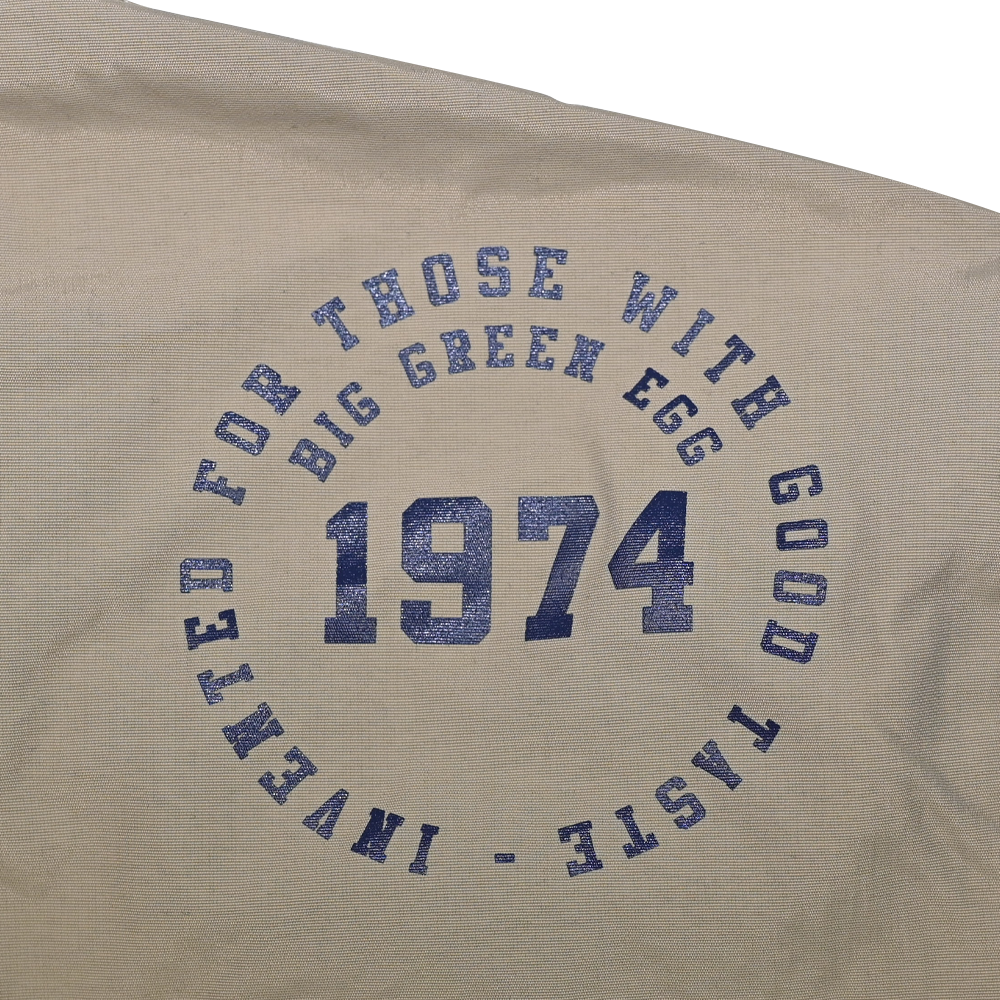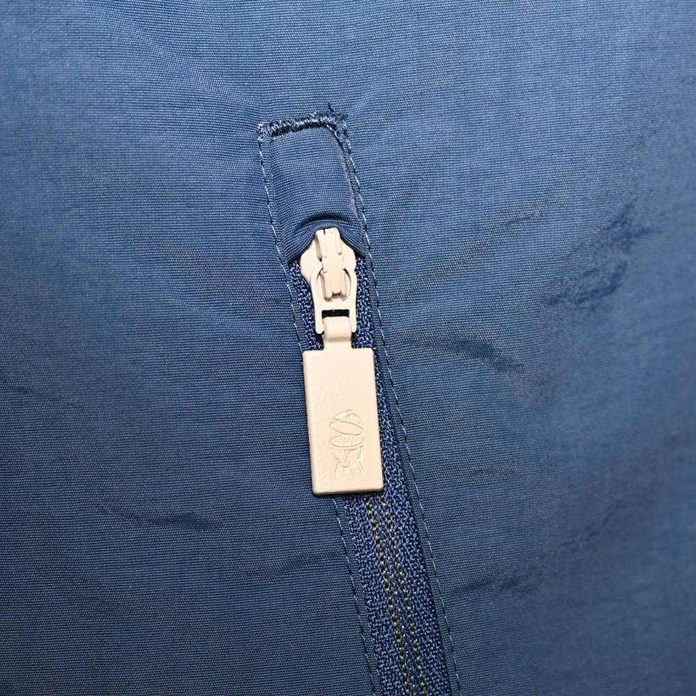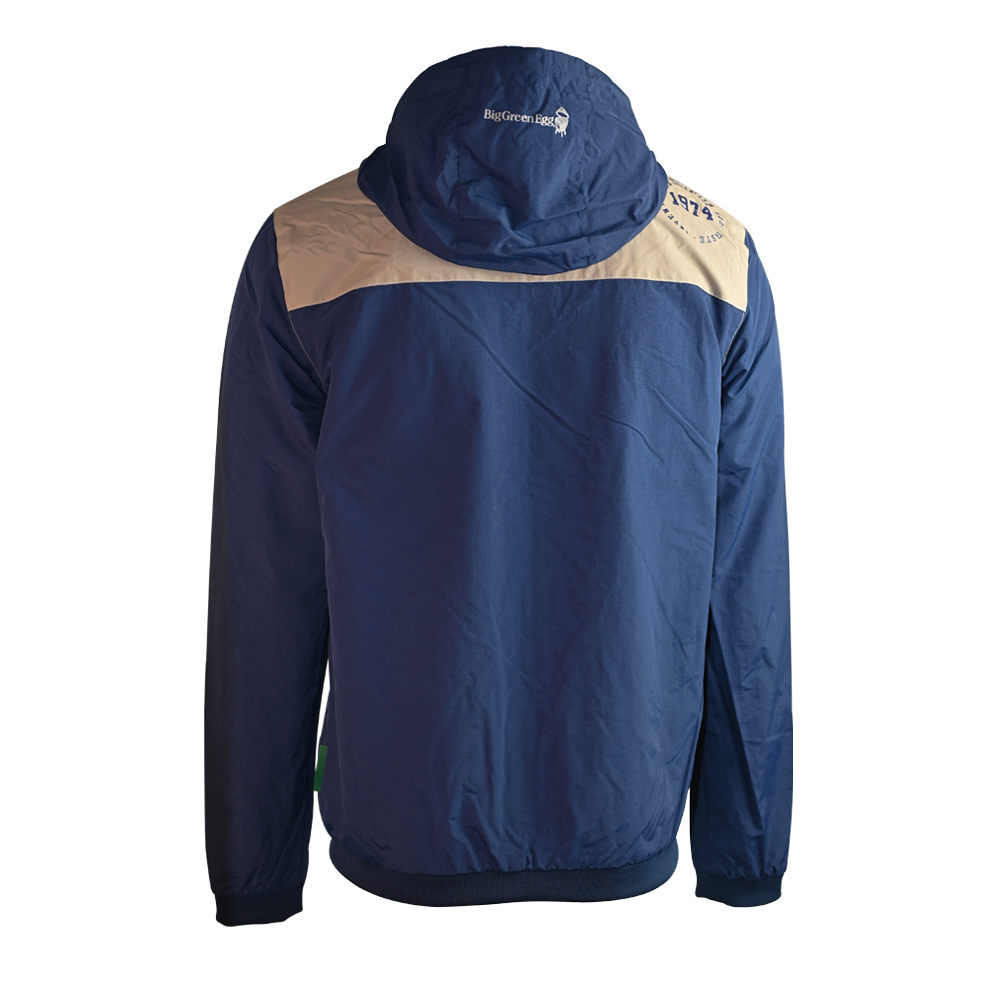 Die Jacke ist in Dunkelblau und Taupe ausgeführt und mit einem dunkelblauen, atmungsaktiven Meshfutter ausgestattet. Ebenso wie die Reißverschlüsse und das Kapuzenband sind auch die stilvollen Akzente in Taupe ausgeführt: Nämlich das Logo „1974 Invented for those with good taste“ in Höhe der rechten Schulter, und die Aufschrift „Big Green Egg“ auf der Brust und der Kapuze. Und auf der Kapuze prangt zusätzlich noch ein Big Green Egg. Subtiles Detail: Auf den Reißverschluss-Ziehern aus Metall sind kleine Big Green Eggs zu sehen. Die Windjacke verfügt über zwei Außentaschen und eine Innentasche, alle mit Reißverschlüssen ausgestattet. Die elastischen Kragen sorgen dafür, dass die Jacke bei rauem Wetter gut abdichtet.